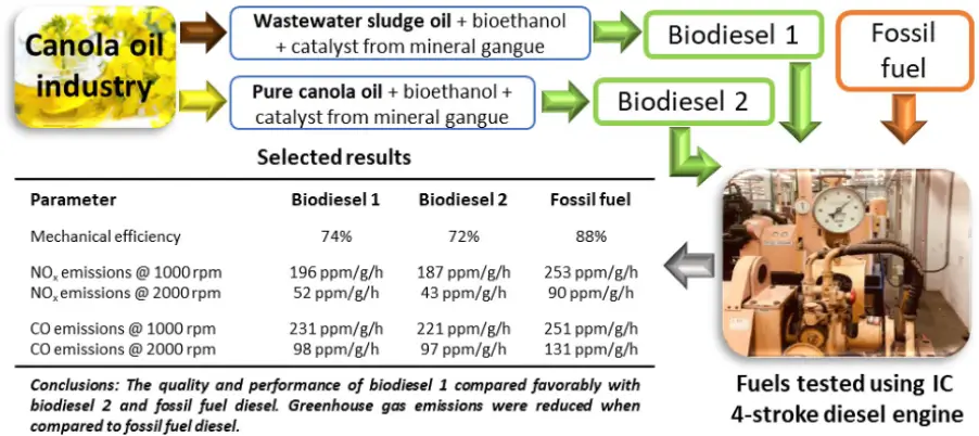 In this study, primary wastewater sludge from the edible oil sector was employed as a novel feedstock for bioethanol synthesis for the production of biodiesel and monounsaturated fats. Utilised was a novel nano-magnetic catalyst created from cupriferous mineral processing waste. An oil-to-ethanol ratio of 1:9, a catalyst loading of 5 weight percent, and a reaction period of 180 minutes at 75 °C were used to get the highest biodiesel yield of 94%. The strategy used in this study can potentially lower the expenses for materials, energy use, and water use related to traditional biodiesel production processes. Additionally, while simultaneously reducing waste, it might lessen the adverse effects of conventional biodiesel manufacturing on the security of food and land. The biodiesel produced was successfully tested using a single-cylinder four-stroke diesel engine (Figure 13) (Ngoie, W.I, Welz, P.J, Oyekola O.O and Ikhu-Omoregbe, D, 2020).